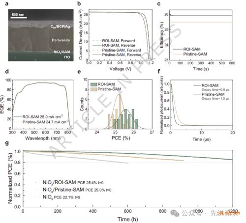 图4聚焦器件最终性能,通过多项表征证实优势:截面SEM展示完整层状结构;J-V曲线显示ROI-SAM体系PCE达26.5%(认证26.28%),Jsc、Voc、FF均优于常规SAM;EQE和稳态PCE验证效率真实性;TPC测试表明电荷提取更高效(延迟0.8μs);MPP跟踪显示T₉₀>1000小时,证实效率与稳定性双突破。