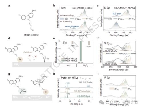 图1聚焦NiOₓ-钙钛矿界面氧化还原反应,验证ROI-SAM策略核心机制:a为新型SAM分子MeOF-4SHCz结构;b、c通过XPS证实其巯基氧化为磺酸基;f显示Ni³⁺被还原,价态均一化;h通过XRD表明钙钛矿结晶质量提升;i验证常规SAM与Ni²⁺的结合未受影响,整体证实双分子靶向结合的有效性