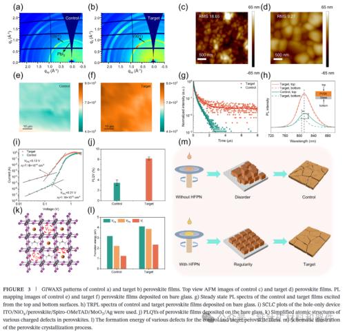 经过HFPN调控后的钙钛矿薄膜结晶度更高、表面粗糙度更低,界面和体相缺陷得到明显抑制。PL与TRPL结果显示,薄膜非辐射复合显著减少,平均载流子寿命明显延长,顶部与底部激发的发光峰几乎重合,印证了A位阳离子的均匀环境。SCLC测试表明陷阱态密度大幅下降,DFT计算也显示关键缺陷的形成能被明显抬升。