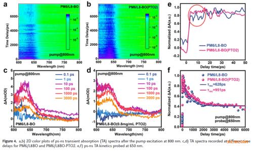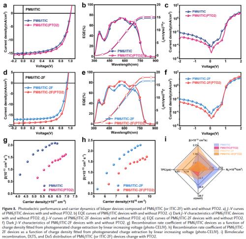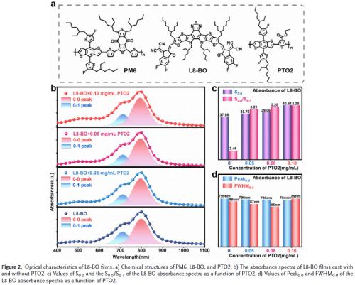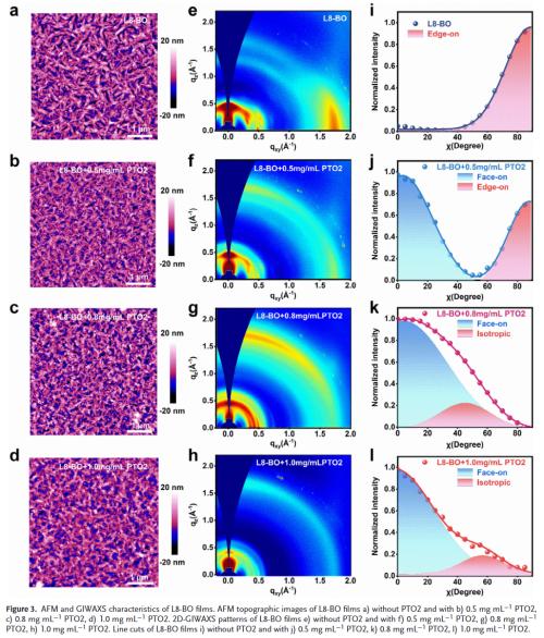 分子取向精准调控:通过引入聚合物给体PTO2作为添加剂,成功将受体L8‑BO的分子堆积从边缘取向转变为有利于垂直电荷传输的面取向,显著提升电荷传输效率。