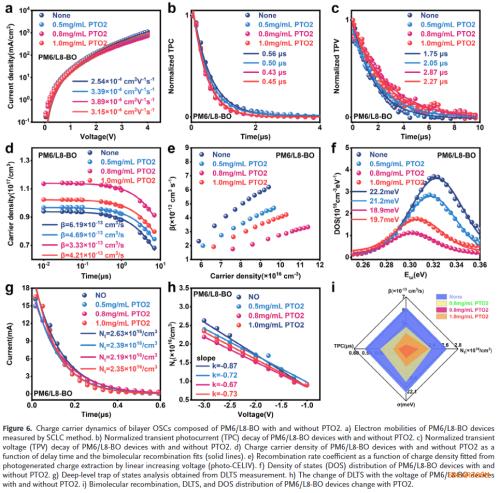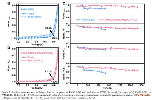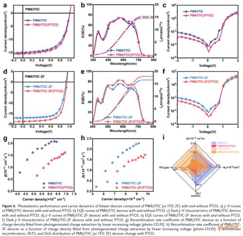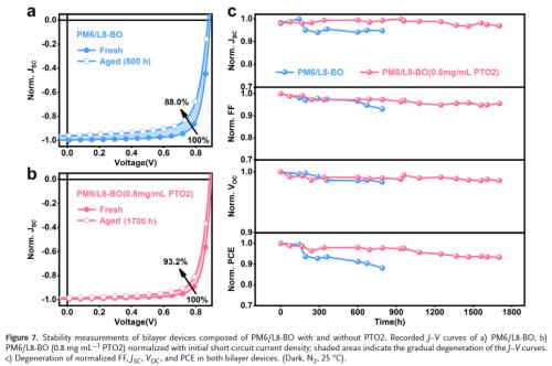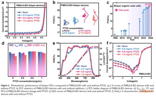 创纪录电池效率:在PM6/L8‑BO双层器件中,优化后的PCE达到20.2%,填充因子接近80%,是目前双层有机太阳能电池的最高效率。