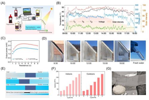 利用太阳能同时生产电力和淡水对于缓解全球能源和水资源短缺问题至关重要。尽管太阳能发电和海水淡化技术已得到广泛研究,但它们通常作为单一功能系统运行。一方面,在太阳能热发电过程中产生的大量低品位废热未得到有效利用,导致能源浪费。另一方面,在海水淡化过程中发生的盐分积聚会降低系统的太阳能吸收效率。因此,单一功能系统中的太阳能总体利用效率受到限制。在此,本研究设计了一种全新的、全被动一体化集成热电系统(SPI-TEG),将高效光热转换、温差发电、蒸发冷却脱盐及海水资源化回收等多过程无缝耦合,显著提升了太阳能综合利用率。该系统仅依靠太阳光在单一设备中同时生产电能、淡水、浓缩盐水和固体盐,实现了水、电、盐的协同生产与零废液排放,为可持续资源回收提供了新途径。
