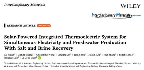 近日,陕西科技大学材料科学与工程学院光热材料的功能化调控与应用创新团队在材料学国际顶级期刊《InterdisciplinaryMaterials》(影响因子:31.6)上发表了题为“Solar‐Powered Integrated Thermoelectric System for Simultaneous Electricity and Freshwater Production With Salt and Brine Recovery”的研究性论文,并被选为当期Outside Front Cover(正封面)。陕西科技大学王成兵教授、北京航空航天大学谢宏耀、赵立东教授为论文共同通讯作者,博士研究生王璐和张文赫为论文第一作者,陕西科技大学为第一通讯单位。