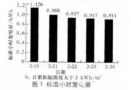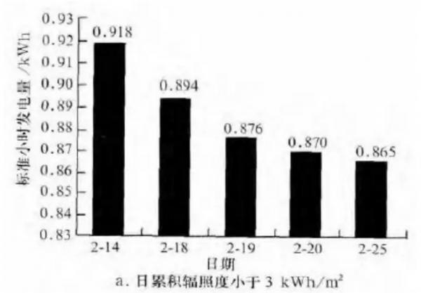 张风等[3]对不同日累计辐照量的标准小时发电量进行对比实验,得出面板表面灰尘越多其输出功率越低的结论,发电性能也越差(见图1)。