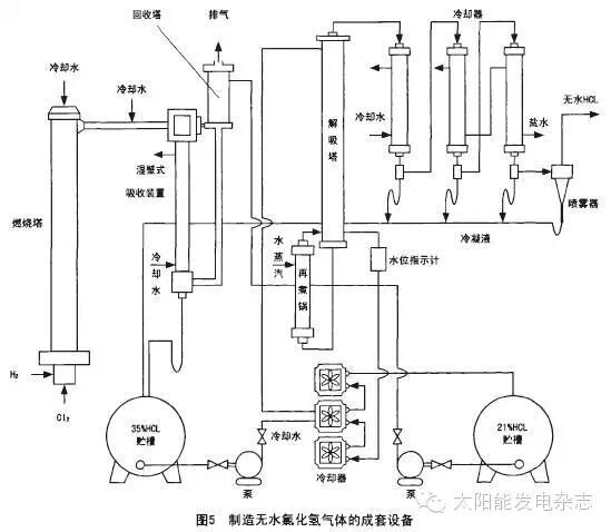 portant; box-sizing: border-box !important; word-wrap: break-word !important;">我国是硅材料的生产大国,但不是强国。这也就是说,我国可规模化生产粗硅(99.9%),但生产精硅(99.99999%)的技术滞后,产量低。硅材料产业现状是卖出粗硅,买回精硅,生产出光伏产品后再销往国外。因为生产精硅,需用高纯度的石墨坩埚,其金属杂质含量要<2×10-5,这就需用干燥的氯化氢来进行纯化处理。图5是制造无水氯化氢的整套工艺流程图。纯化是基于在高温下金属杂质与氯化氢生成低沸点氯化物而挥发逸走,使石墨化得到纯化。此外,也可采用氯气纯化。