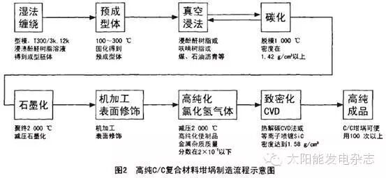 portant; box-sizing: border-box !important; word-wrap: break-word !important;">拉制单晶硅采用组合式坩埚,外为C/C坩埚,内为石英坩埚。这是因为熔融硅的温度与石英熔点相近,都在1420℃左右,石英坩埚在这温度下处于软化状态,没有承重能力,外部C/C坩埚是承重的主体。但是,熔融硅不能直接与C/C坩埚接触,以防SiC的生成,因而采用了组合式坩埚。制造高纯度C/C复合材料坩埚的流程很长,从原材料的选择、准备、坯体的制造、增密、纯化、热处理等等,生产工艺过程长。图2中列出了坩埚制备的一般生产路线。根据使用要求选择炭纤维,预制成2-多维炭纤维多孔坯体;对坯体进行纯化后进行增密;纯化和高温热处理。材料制备过程中视情况可穿插安排多次纯化和石墨化处理。根据材料性能要求,可以只采用化学气相沉积(CVI)增密工艺,也可以采用CVI和浸渍复合增密工艺;例如:可以先浸渍树脂或沥青,达到一定的密度后,再对材料进行化学气相沉积或化学气相渗透;也可以先对坯体进行化学气相沉积至一定的密度,再进行浸渍增密。中间的炭化和高温热处理主要是为打开多孔坯体表面的气道,使坯体增密能继续有效进行;纯化处理则是除材料中的金属杂质,最终的高温处理则主要是对材料进行组织结构的调整,以保证材料的综合使用性能。