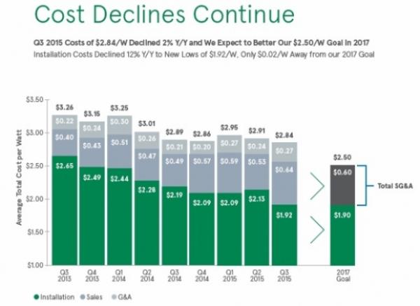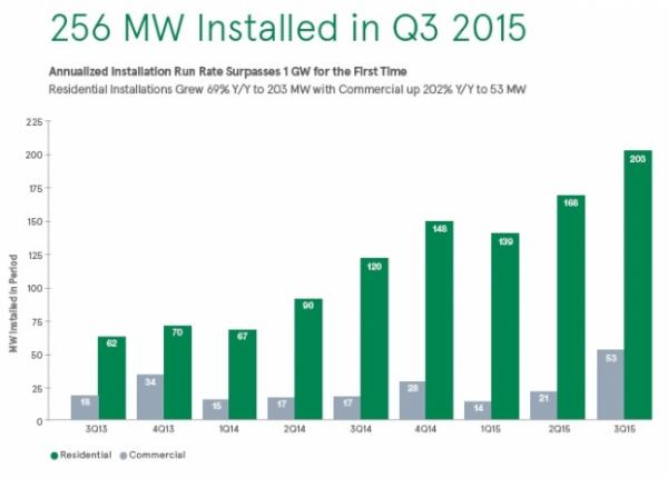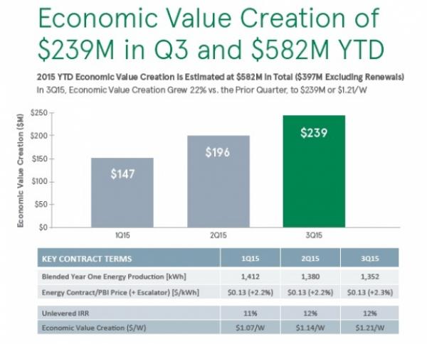 SolarCity报告,第三季度安装量总计为256MW,每瓦成本创纪录低至2.84美元,为其普通股股东产生2.39亿美元增量“经济价值创造”。