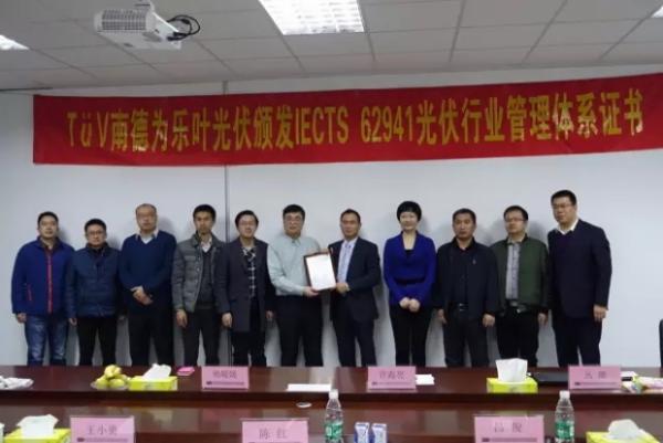 TÜV SÜD光伏与智能电力设备副总裁许海亮先生表示:“乐叶光伏是第一家获得TÜV SÜD IEC TS 62941的光伏企业,在审核过程中乐叶的专业、认真、积极改善的诸多细节让我们印象深刻,也彰显了乐叶对产品品质的重视以及勇于挑战自我的魄力。”