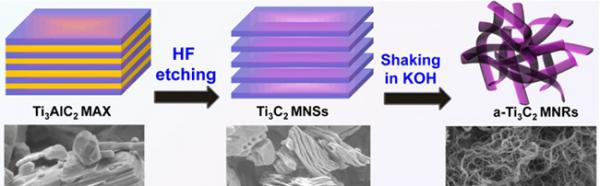 近日,中科院大连化学物理研究所二维材料与能源器件研究组(DNL21T3)吴忠帅研究员团队通过在KOH溶液中震荡处理二维金属碳化物纳米片(MXene),成功制备层间距扩大的碱化MXene纳米带,并发现其具有优异的储钠和储钾性能。相关研究成果发表在《纳米能源》(Nano Energy)杂志上(DOI: 10.1016/j.nanoen.2017.08.002)。